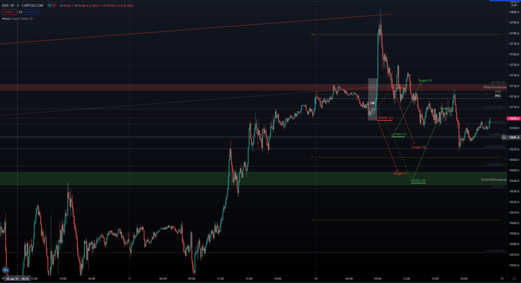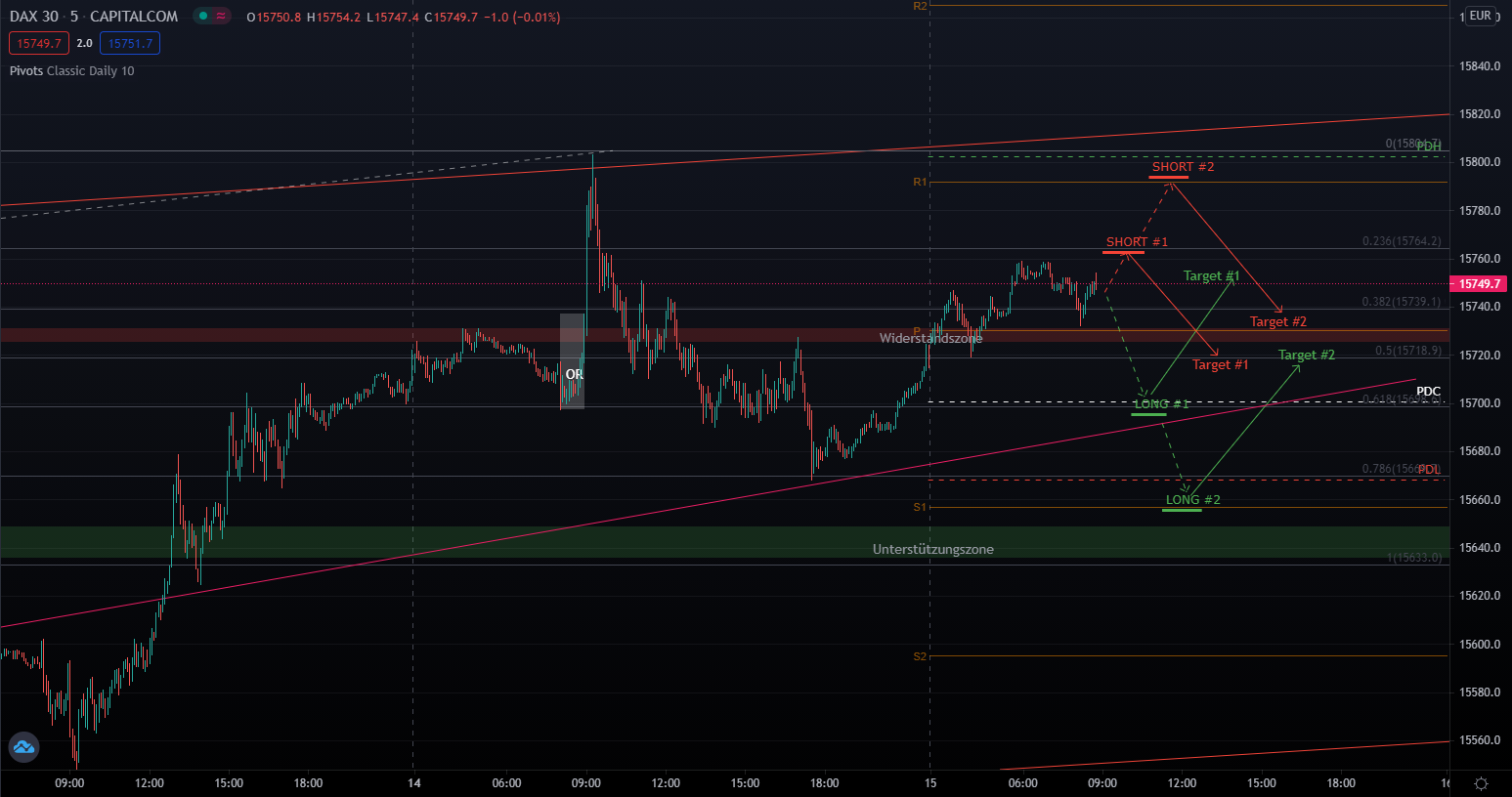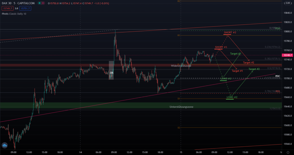 Long #1: Entryzone: ca. 15700 (PDC) –> Targetzone: ca. 15750 (Eröffnungskurs?)