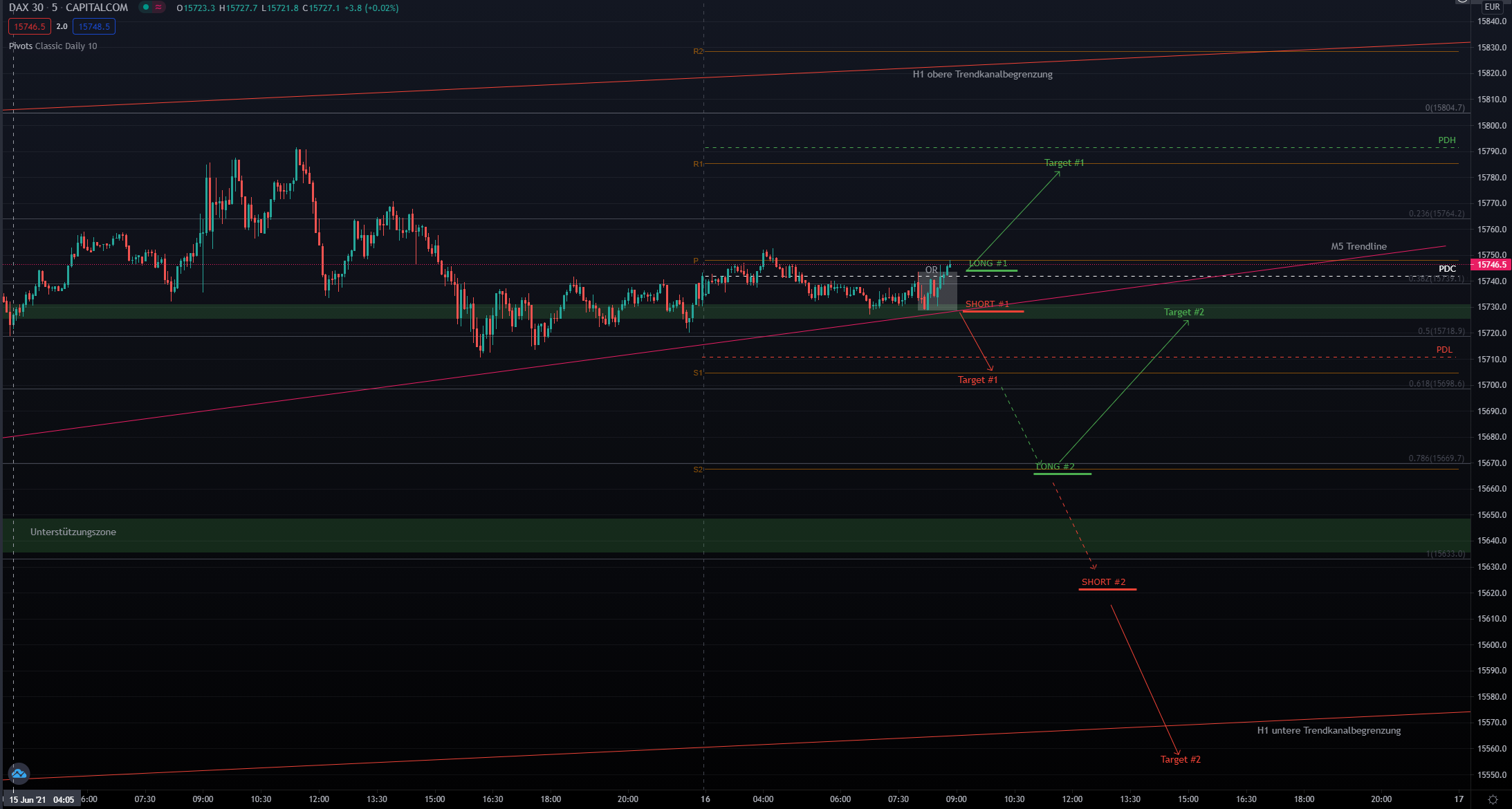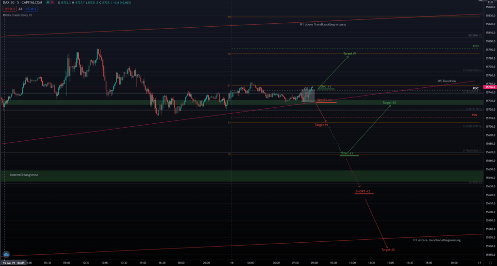 Entryzone: ca. 15630 (100er Fib) –> Targetzone: ca. 15550 (Trendkanalbegrenzung)