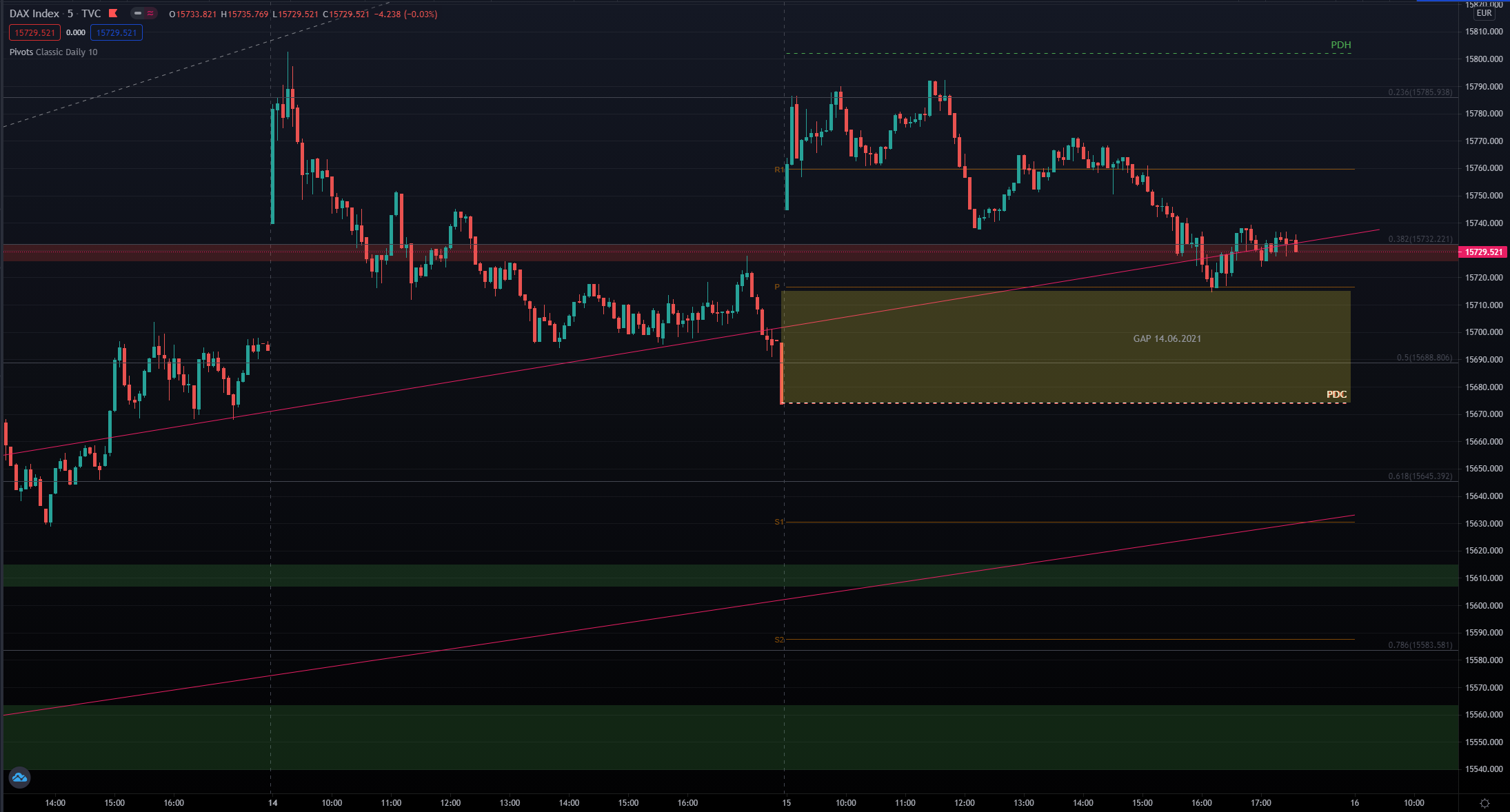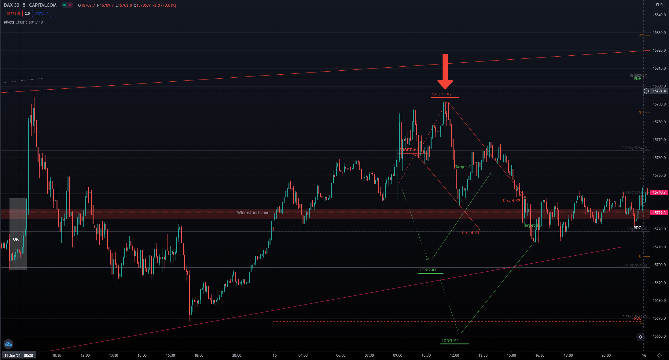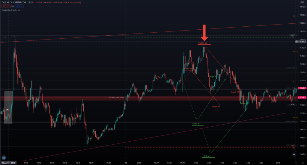 Entryzone: ca. 15730 (ORB) –> Targetzone: ca. 15700 (61er Fib)
