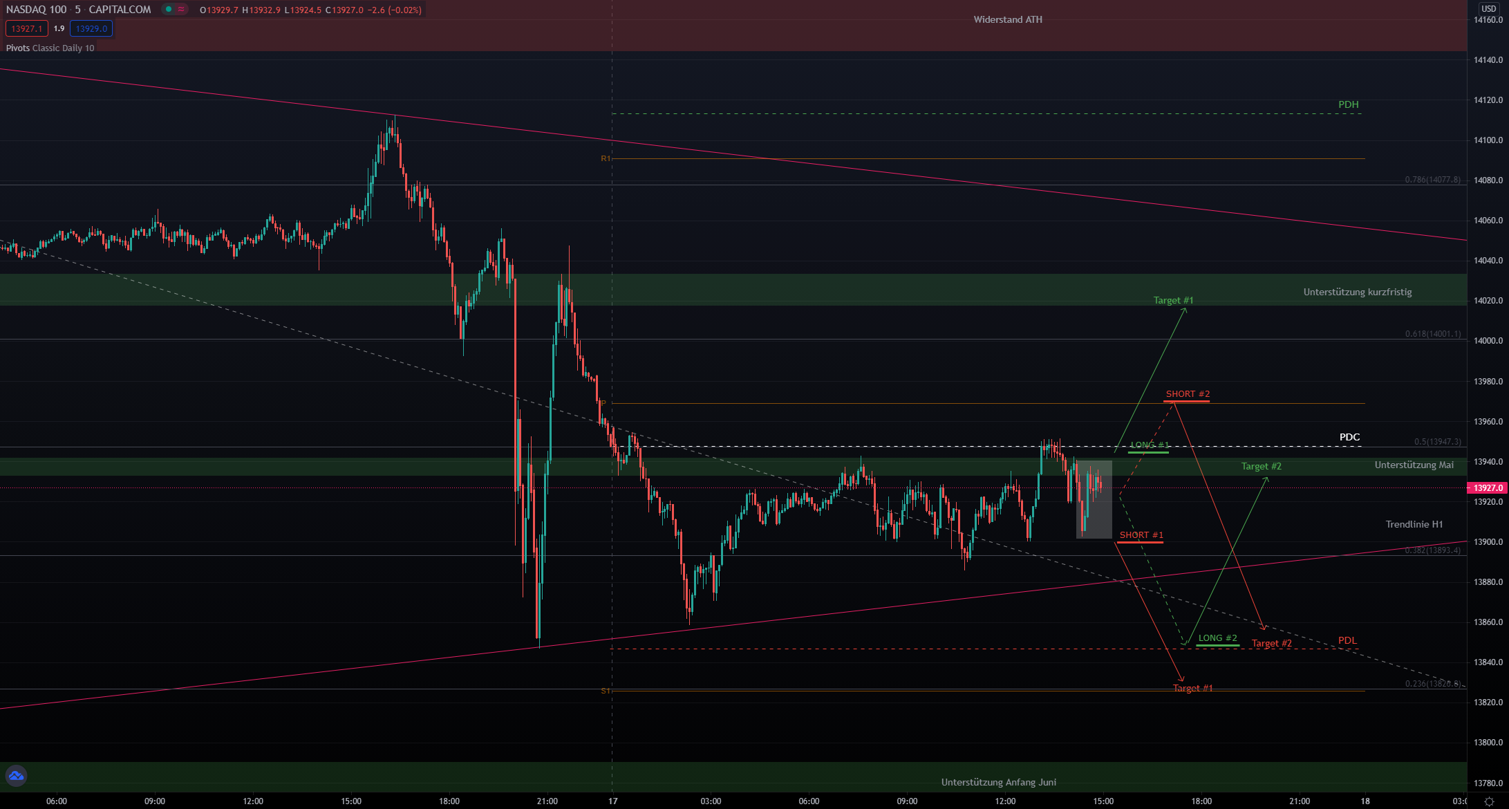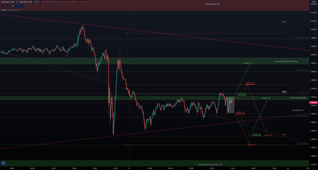 Entryzone: ca. 13850 (PDL) –> Targetzone: ca. 13950 (Unterstützung Mai)