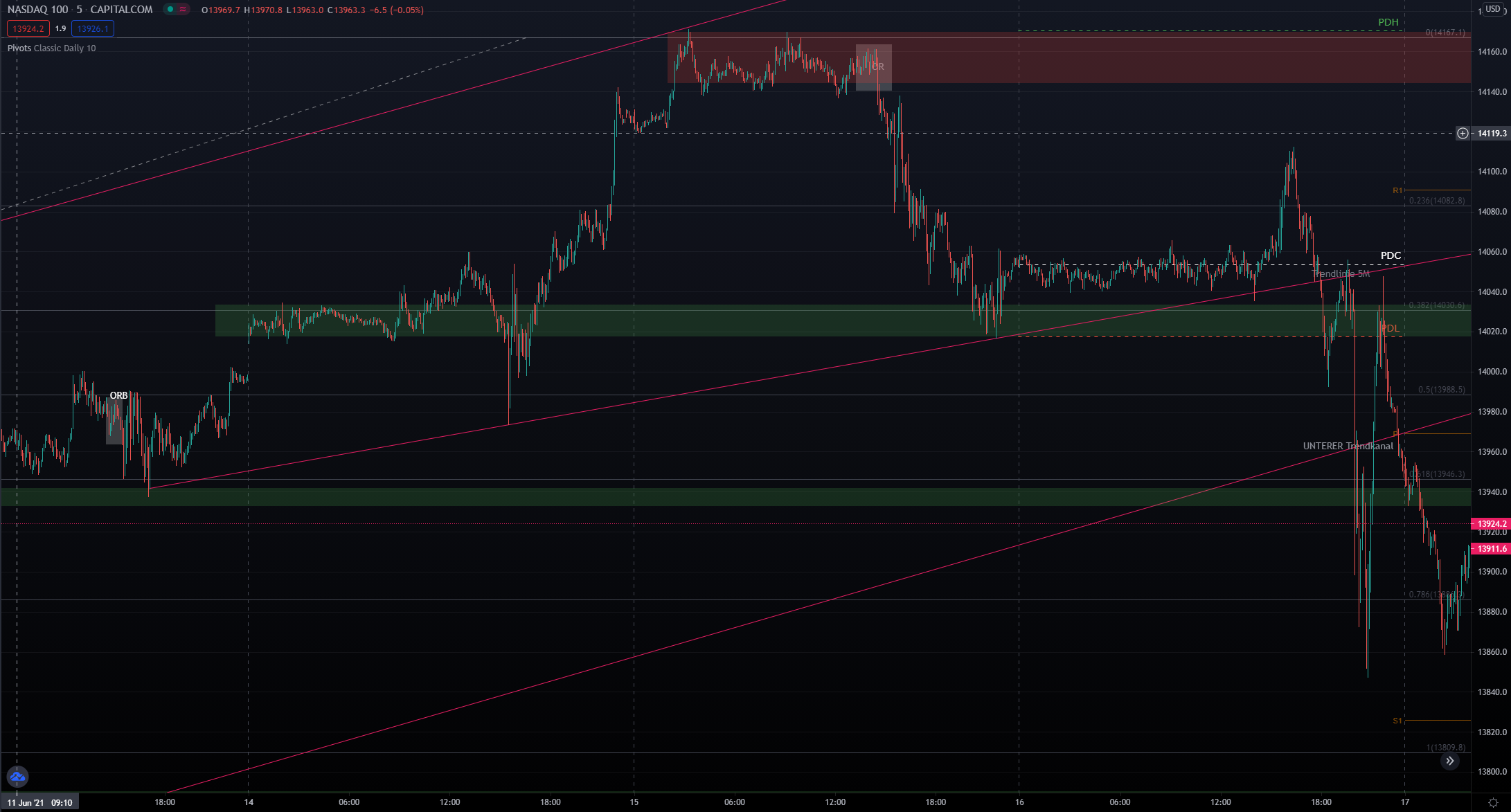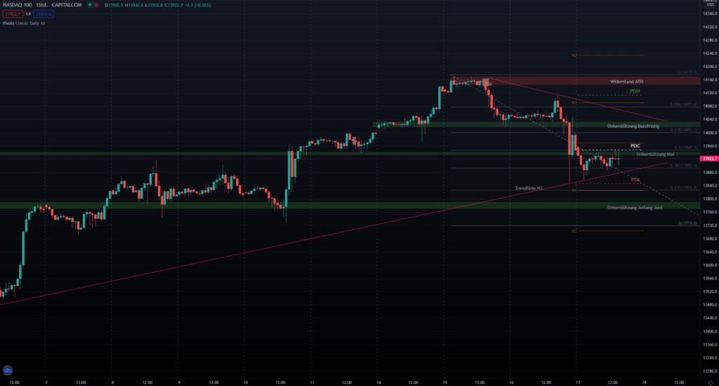 Entryzone: ca. 13970 (Pivot) –> Targetzone: ca. 13850 (PDL)