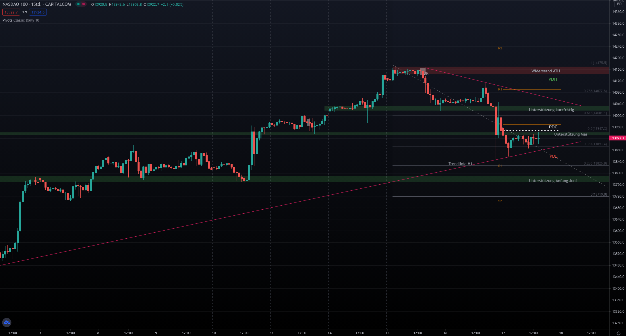 Vorbörslich pendelt der Nasdaq mit einer leichten Longtendenz zwsichen 13900 und 13800. Dabei prallt er immer wieder an der Unterstützungszone aus Mai ab. Im Stundenchart H1 lässt sich ein Dreieck konstruieren. Ein Ausbruch aus diesem Dreick dürfte das nächste längerfristige Signal für Long oder Short generieren.
