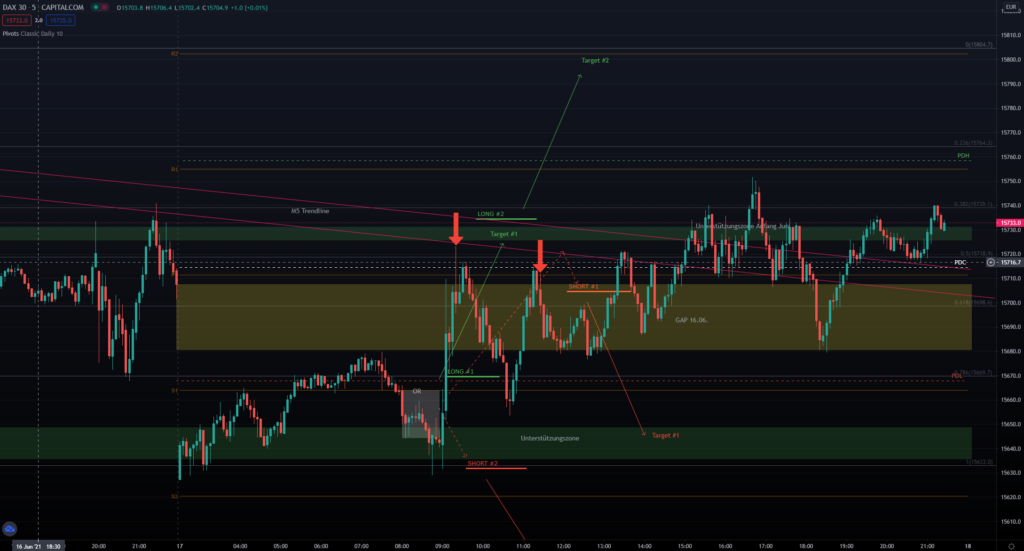 Entryzone: ca. 15690 –> Targetzone: ca. 15650 (Unterstützung)