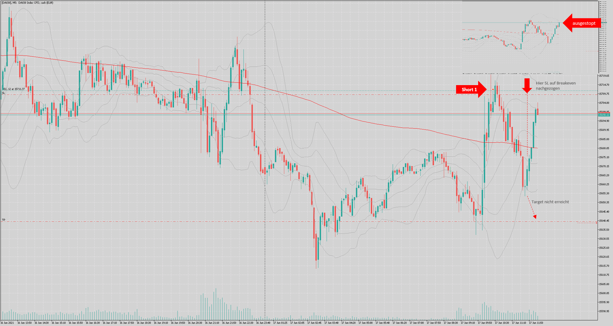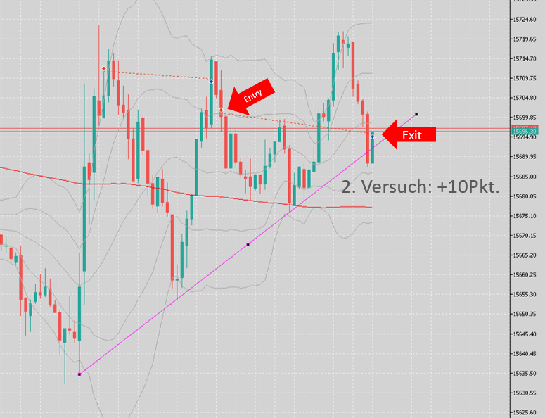 Ein zweiter Versuch den Short 1 zu traden bliebt ebenfall mit nur 10 Pkt nahezu erfolglos.