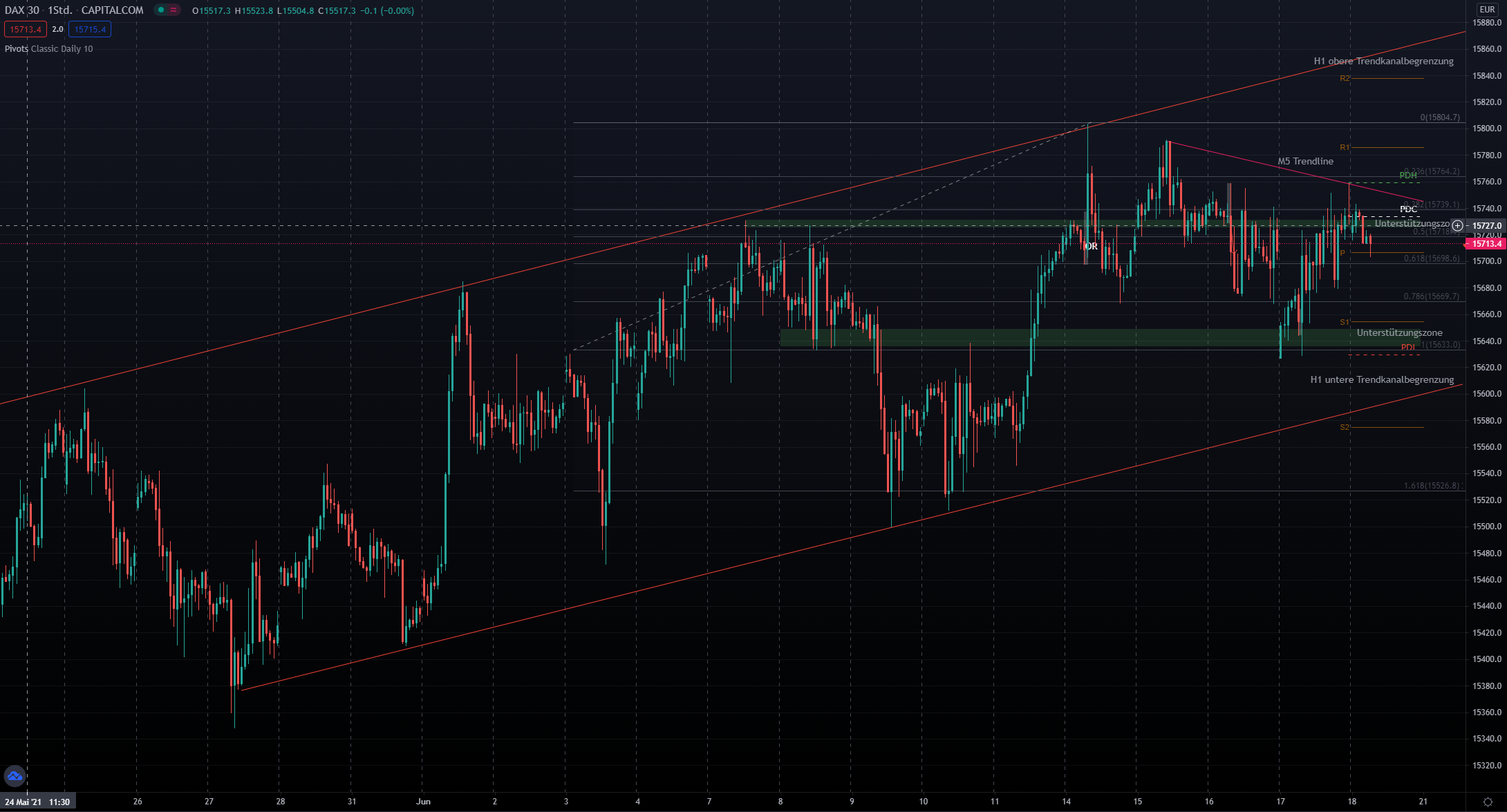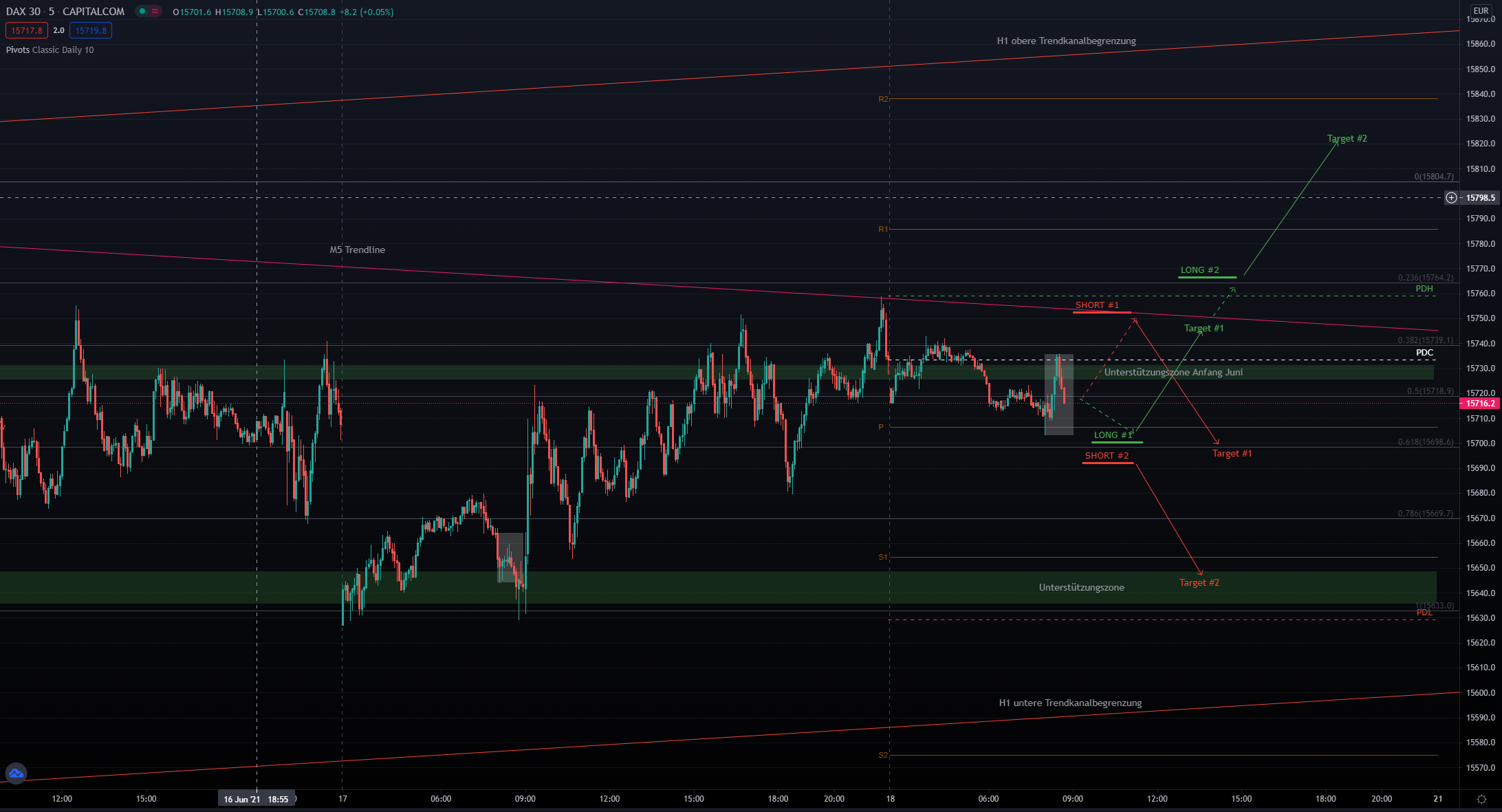 Entryzone: ca. 15700 (Pivot) –> Targetzone: ca. 15750 (Trendlinie)