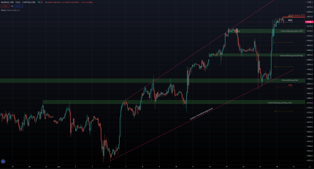 Im Stundenchart sieht man sehr schön, dass der Nasdaq seit dem 04.06.2021 einen deutlichen Longtrendkanal ausgebildet. Während er am Mittwoch noch empfindlich reagierte, auf die Ankündigung der FED die Zinsen mittelfristig anzuheben, zeigte er gestern mit dem neuen Allzeithoch sehr eindrücklich Stärke. Die Frage nach einer Überhitzung stellt sich, insbesondere mit Bklick auf einen schwachen DowJones. Somit erwarte ich für heute mehr eine Korrektur als einen weiteren Anstieg.