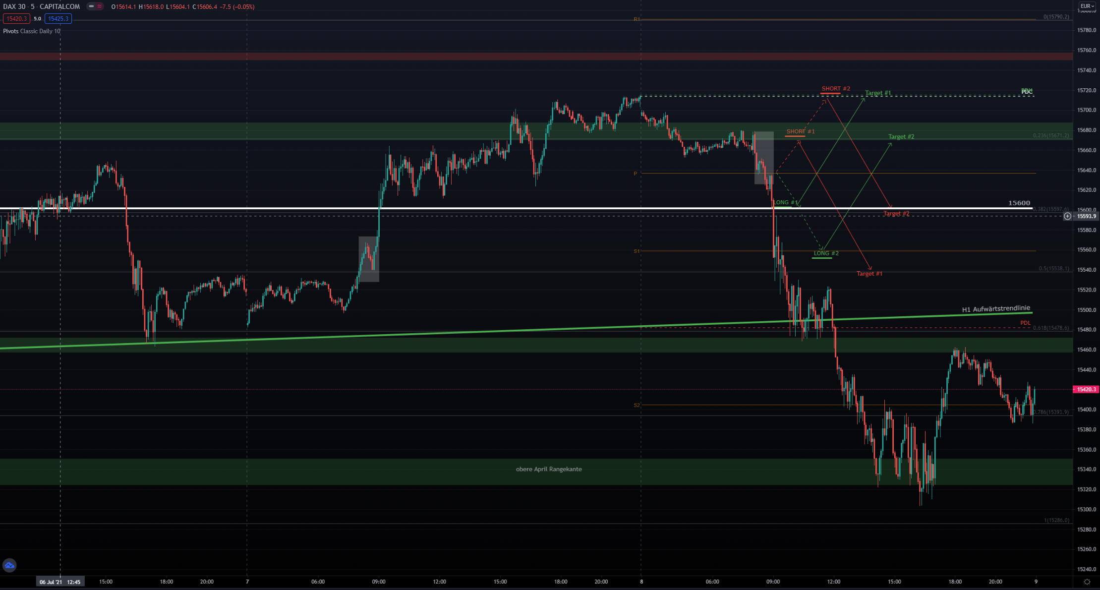 Eine vorbörsliche Long Dynamik ist im M5 Chart gut zu erkennen. Diese stoppt jedoch zunächst an der 15480 und damit genau an der Unterstützungszone. Eine dynamische Eröffnung ist wahrscheinlich. Je nachdem werde ich mich für einen ORB Long oder Short (Ausbruch unterhalb der Unterstützung) auf die Lauer legen. Sollte der Ausbruch Short erfolgen, halte ich für den weiteren Verlauf des Tages trotzdem die Rückeroberung der 15600 für möglich.