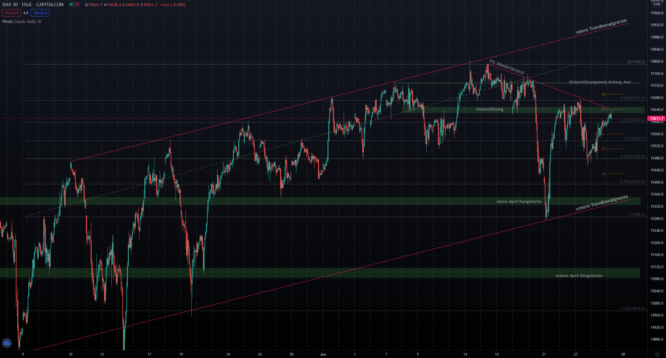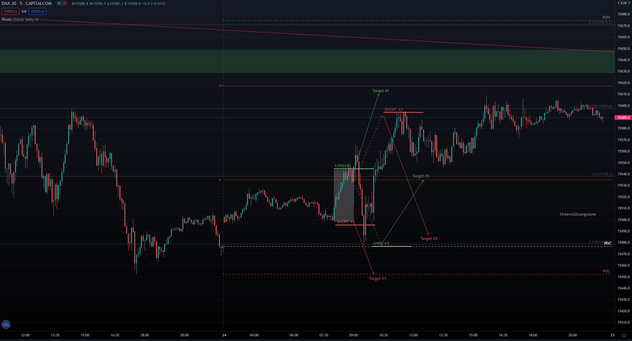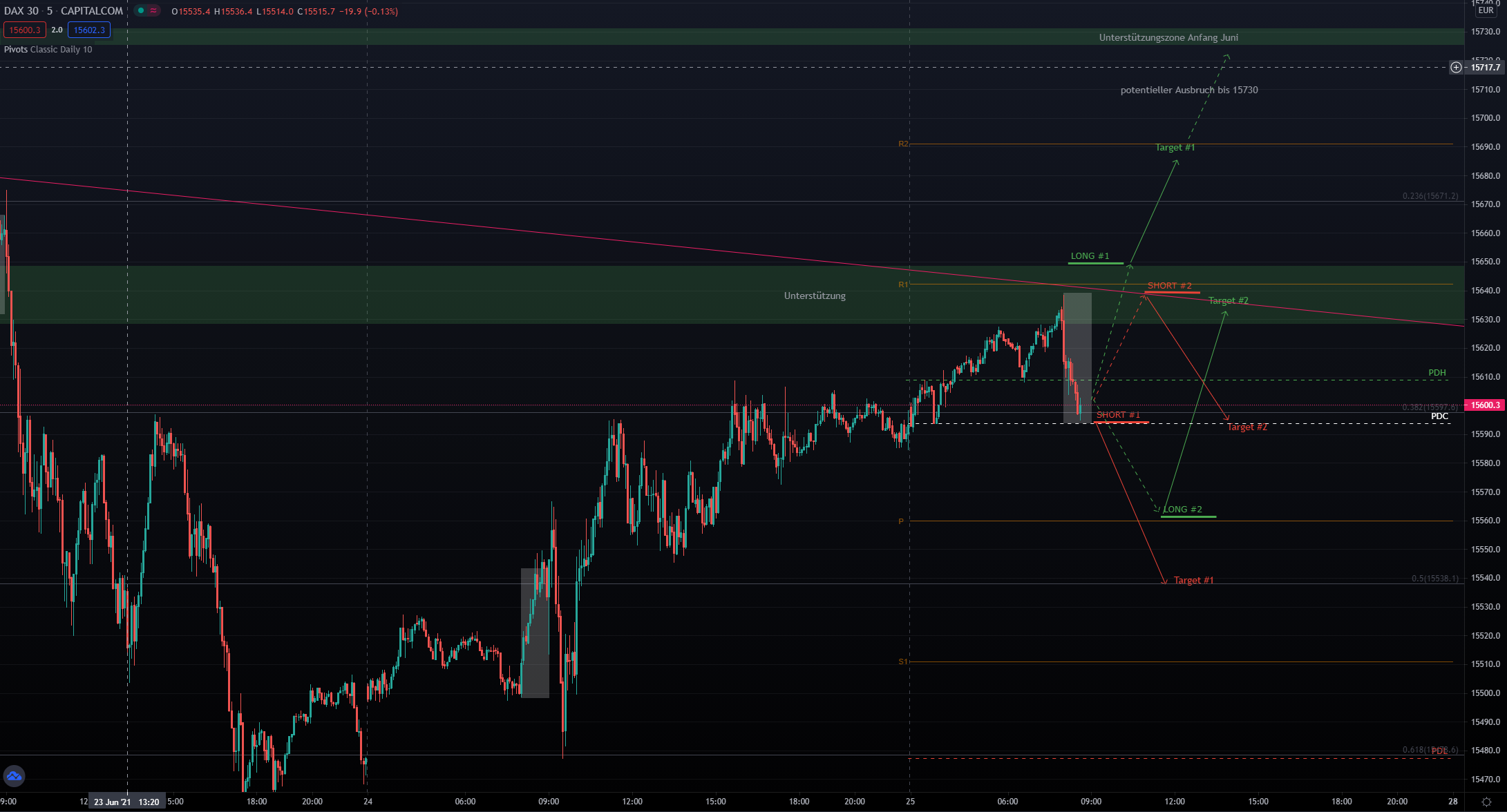 Entryzone: ca. 15560 (Pivot) –> Targetzone: ca. 15630 (Unterstützung)