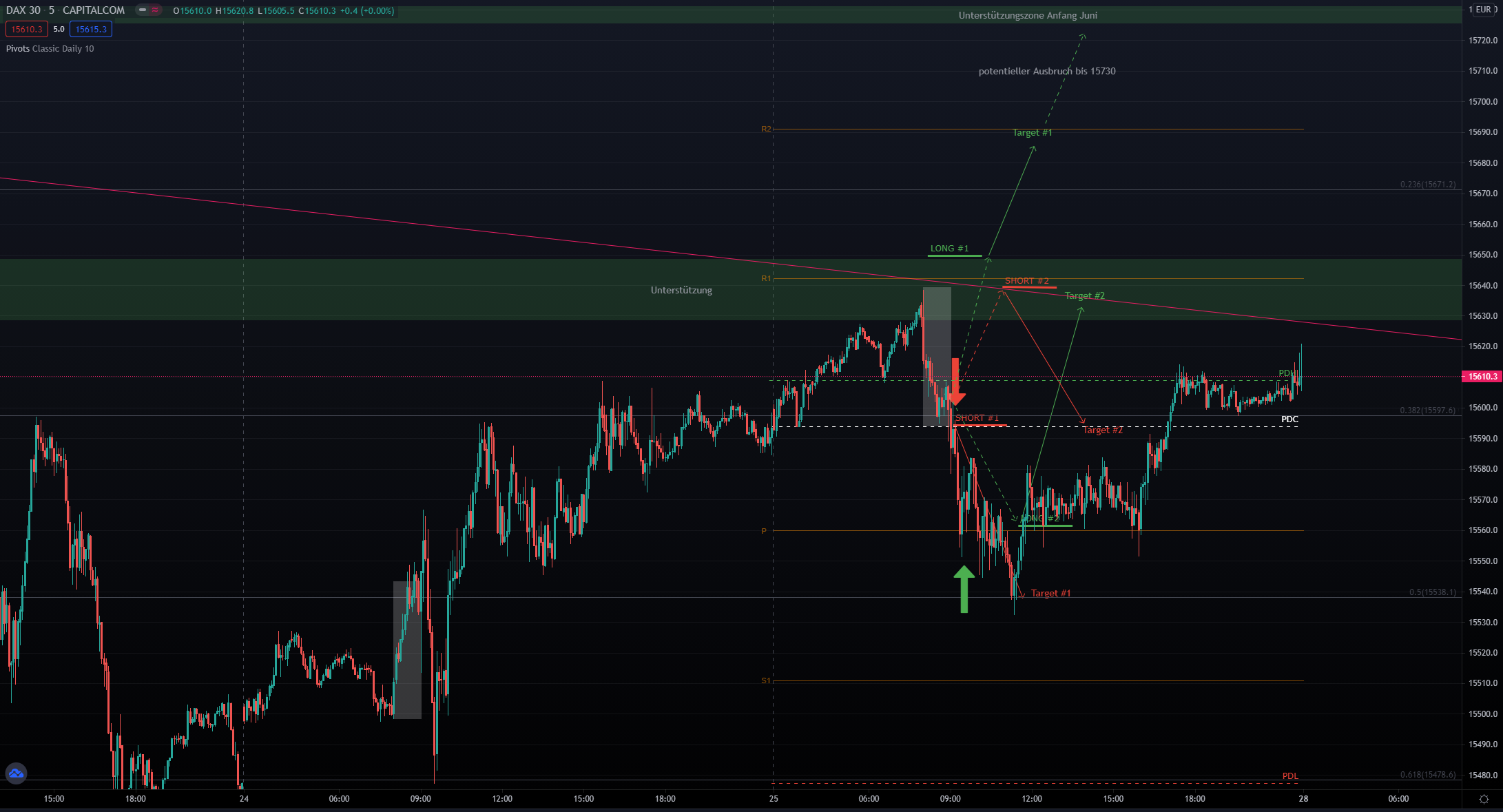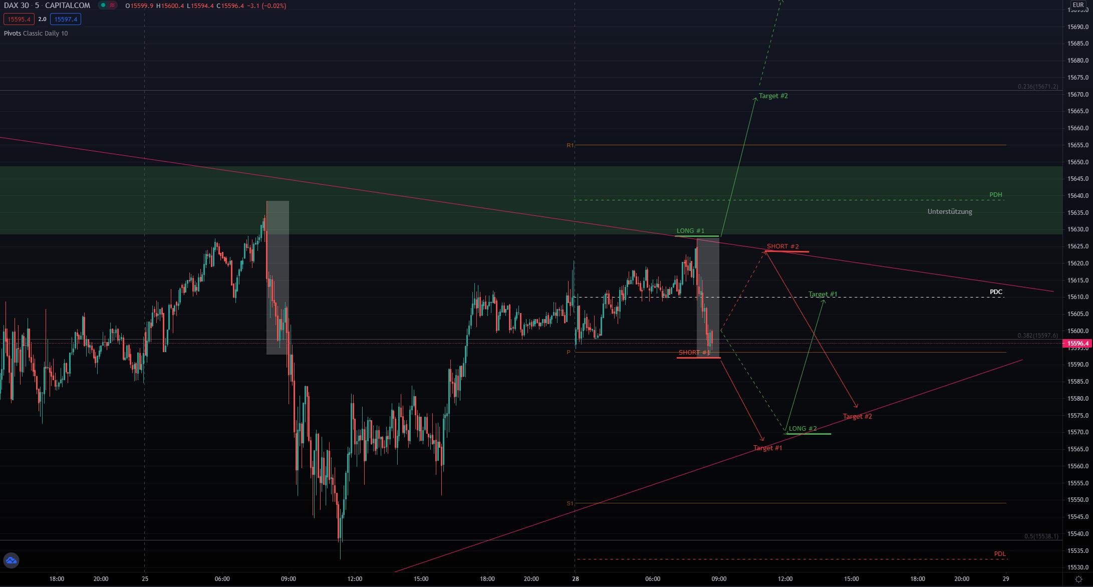 Entryzone: ca. 15595 (ORB) –> Targetzone:  ca. 15570 (Trendlinie)