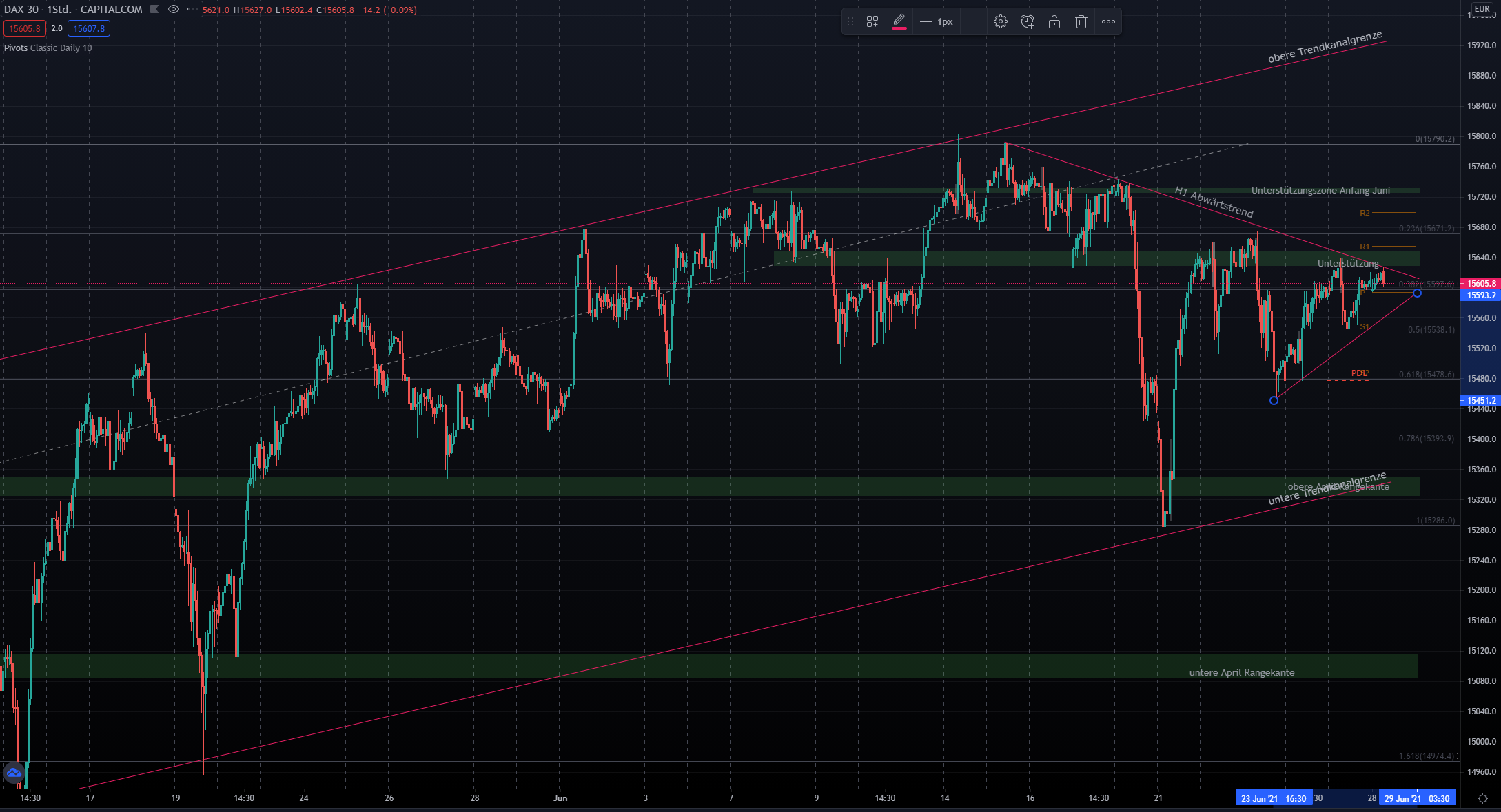 Entryzone: ca. 15570 (Trendlinie) –> Targetzone:  ca. 15610 (PDC)