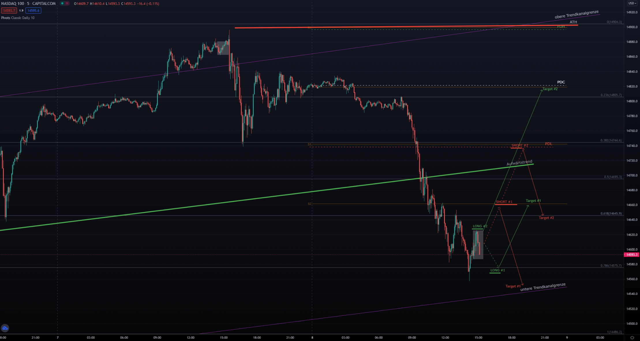Entryzone: ca. 14660 (S2) –> Targetzone:  ca. 14550 (Trendkanalgrenze)