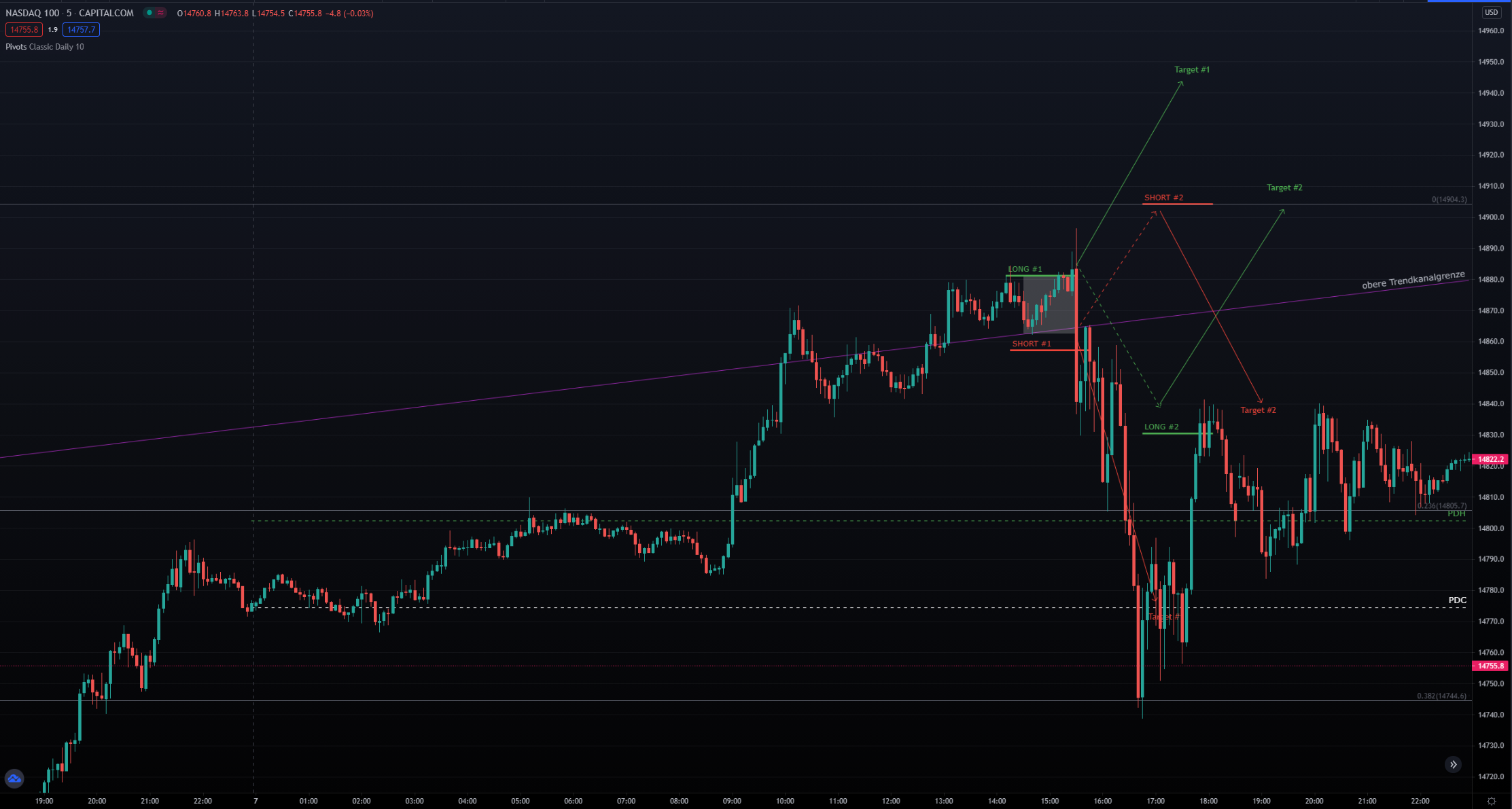 Die Erwartungen wurden gestern enttäuscht. Statt eines Long Tages korrigierte der Nasdaq. Grundsätzlich aber eine gesunde Entwicklung, nach den vielen Rekordtagen. Direkt zum Start deutet der Index noch den Kursanstieg an. Den ORB habe ich getradet und wurde leider mit 20 Punkten Verlust ausgestoppt. Gehört eben auch dazu. Das Short 1 Szenario hingegen wurde bilderbuchgleich erfüllt. Im weiteren Verlauf stabilisierte sich der Kurs im Bereich um die 14800.
