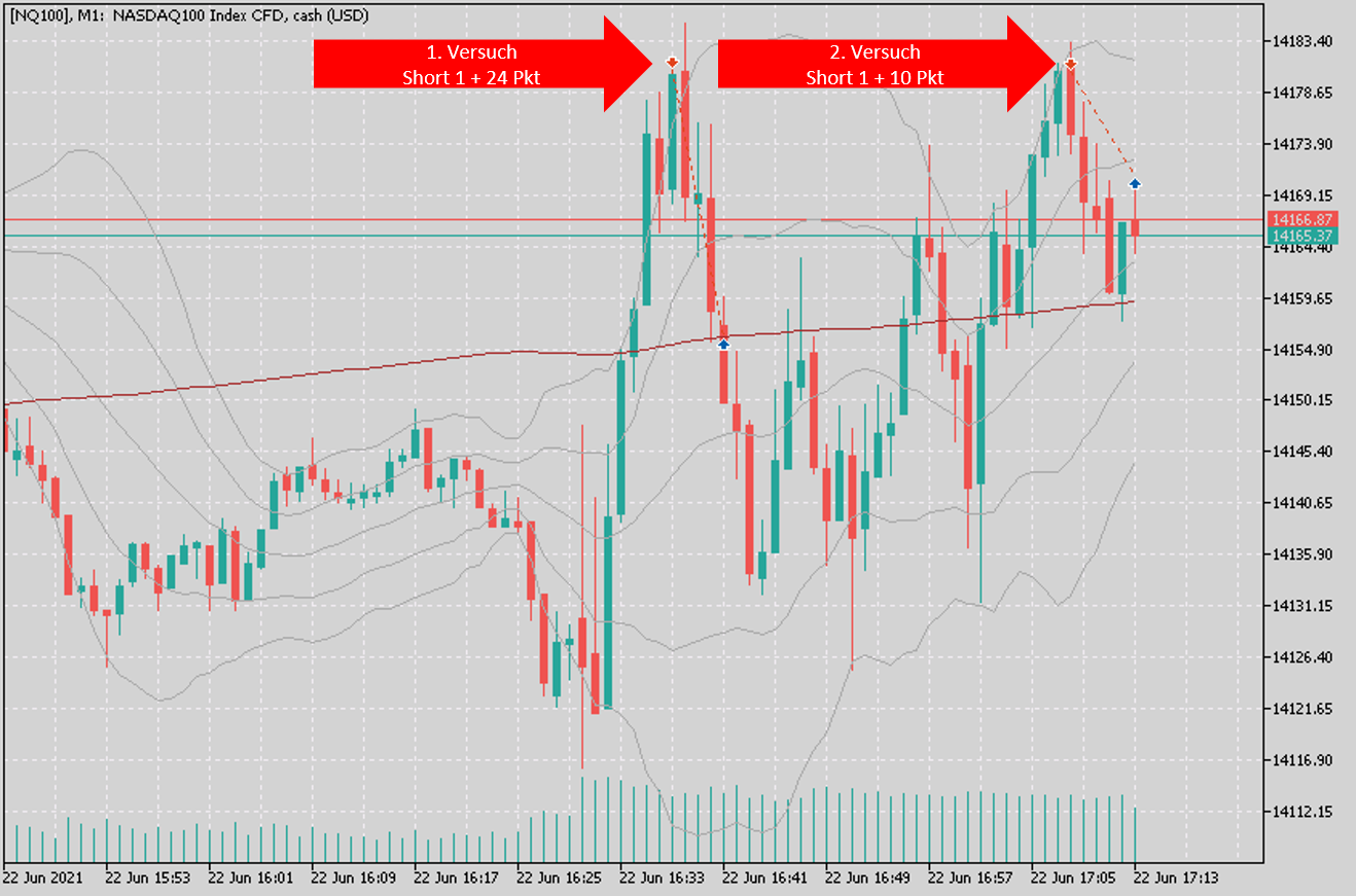 Der Nasdaq hat gestern zur Eröffnung mit der zweiten 5 Minuten Kerze einen Trigger für das Short 1 Szenario gegeben. Der so eröffnete Trade lief auch sauber und recht schnell in den Zielbereich und sicherte die ersten 24 Punkte. Ein weiterer Versuch brachte nochmals 10 Punkte, da der Kurs drehte und in den SL lief.