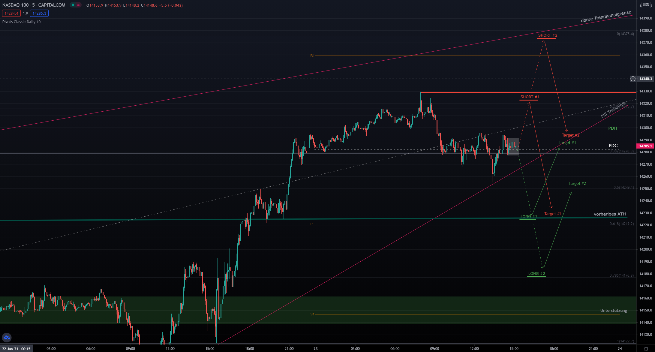 Willkommen zur technischen Chartanalyse im Nasdaq und der Tradeplanung für den 23.06.2021. Zunächst jedoch ein Blick auf den vergangenen Handelstag (die Vortagesanalyse findest Du hier).
