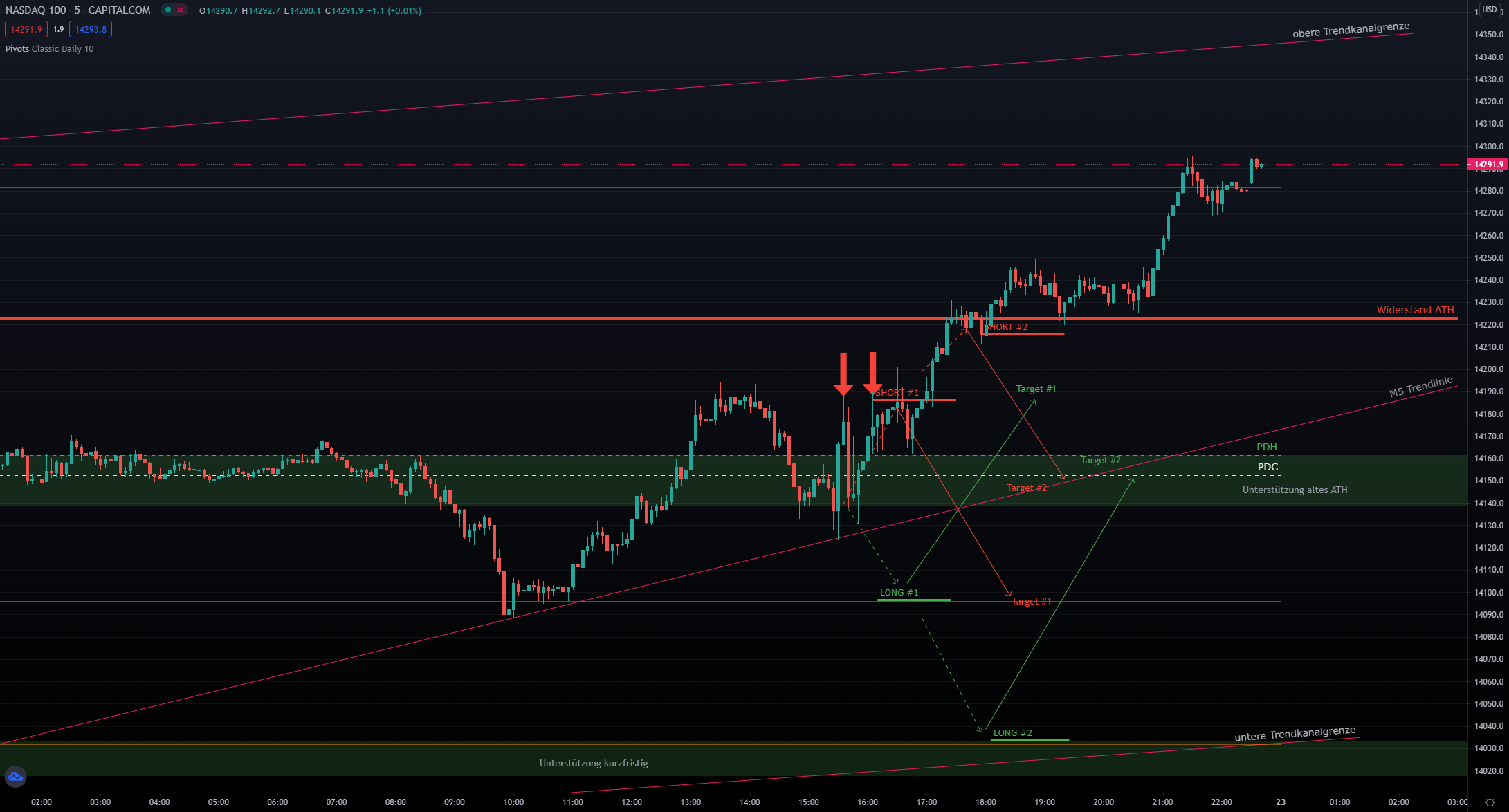 Entryzone: ca. 14330 (Tageshoch) –> Targetzone:  ca. 14230 (ehemaliges ATH)