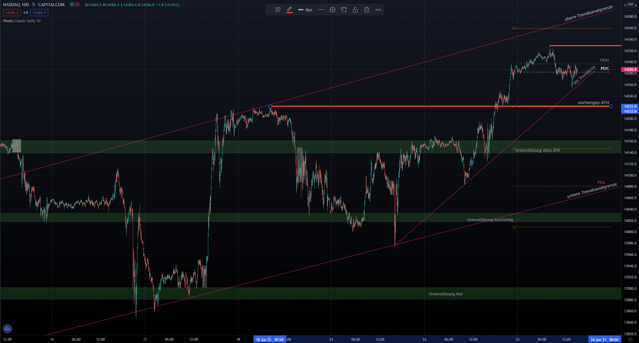 In der gestrigen Handelsvorbereitung sprach ich davon, dass ein neues ATH sehr wahrscheinlich sei. Und so kam es schliesslich auch. Das alte Allzeithoch ist gebrochen und heute Morgen erreichte der Nasdaq das neue Hoch von 14328 Punkten.